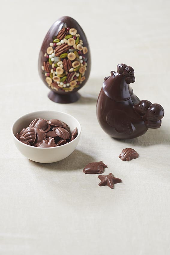 un oeuf version mendiant, une poule en chocolat garnie de fritures ainsi qu'un petit moulage oeuf de Pâques.